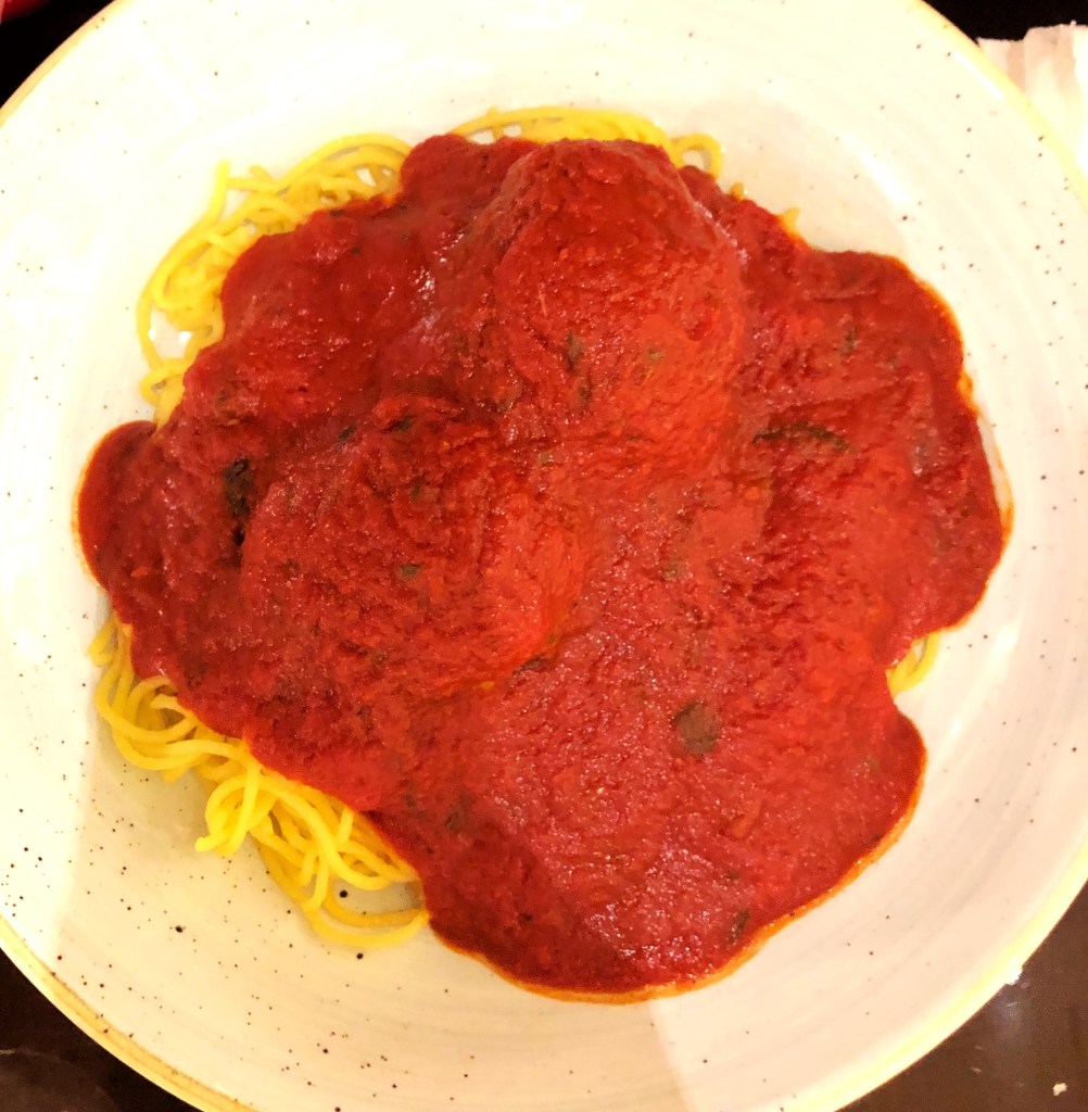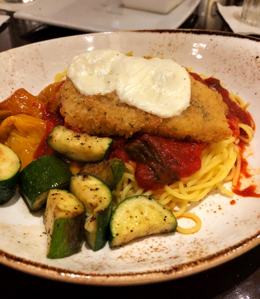 Acima, duas especialidades do Tony’s: o Chicken Parmigiana (espaguete ao molho marinara acompanhado de vegetais locais e peito de frango empanado com mozzarella derretida, $26.00) e o Spaghetti (espaguete ao molho marinara acompanhado de almôndegas suínas e bovinas ou salsichas italianas, $22.00).
