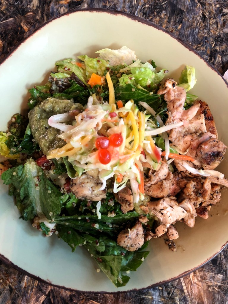 Acima (da esquerda para direita): bowl de grilled chicken + hearty salad + creamy herb dressing e bowl de grilled chicken + rice & black beans + black bean vinaigrette.